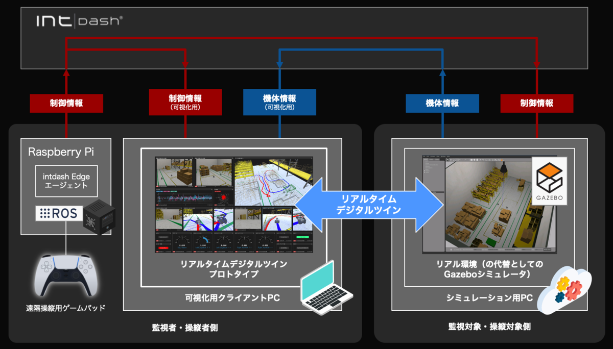 - リアル環境の代替としてクラウド上に設置したGazeboシミュレーターの情報をintdashを用いて伝送し続けています。