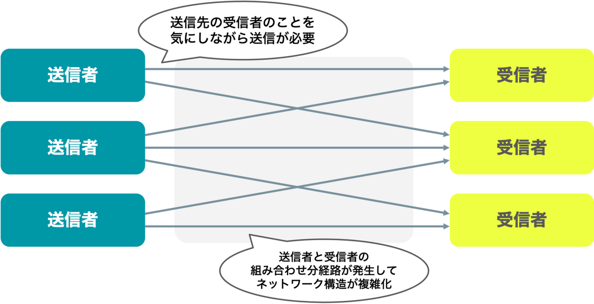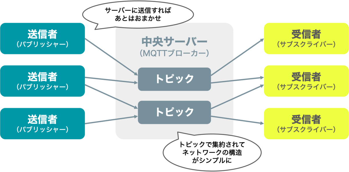 MQTTでは、パブリッシュ/サブスクライブ型のメッセージングモデルが採用されています。このモデルでは、メッセージの送信者(パブリッシャー)が特定のトピックにメッセージを公開(パブリッシュ)し、メッセージの受信者(サブスクライバー)がそのトピックを購読(サブスクライブ)します。メッセージは中央のサーバー(MQTTブローカー)を介してルーティングされ、ブローカーが適切なサブスクライバーにメッセージを配信します。この方式により、デバイス間の直接的な通信が不要となり、ネットワークの複雑さを大幅に削減できます。