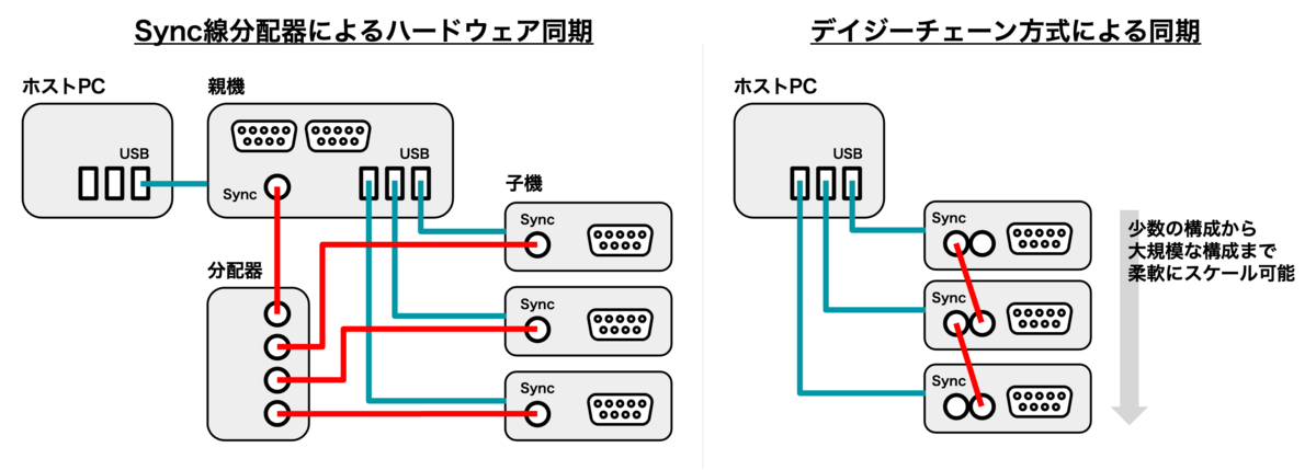 他社製品では、エントリーモデルにはハードウェア同期機構がついていないものも多く、複数デバイスでの正確なタイムスタンプ同期を実現するにはある程度のコネクタ数を備えた上位モデルを採用しなければなりません。一方、当社製品では、単体で使用した場合でも複数で使用した場合でも変わらず、分配器などの追加機器を必要とすることなくハードウェア同期を実現できます。これにより、小規模な構成から大規模な構成まで、柔軟にスケールさせることができ、構成変更があった場合にも既存機器が無駄になりません。