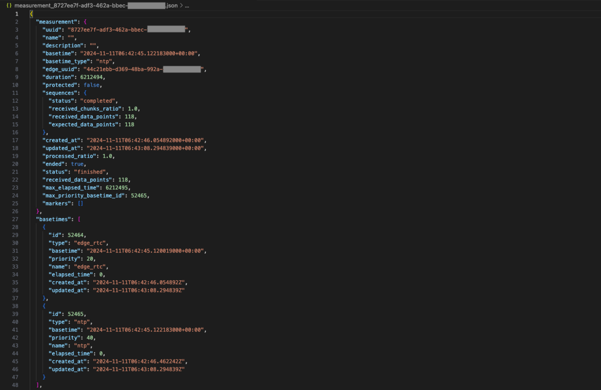 uuid: 計測UUIDbasetime: もっとも優先度の高い基準時刻status: 計測の状態expected_data_points: 総データポイント数received_data_points: 回収済みデータポイント数