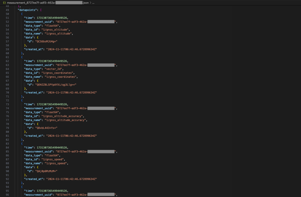 time: 絶対時刻(UNIXエポックからの経過時間、計測の基準時刻+経過時間)data_type: データ型data_id: データを識別する名前data.d: データペイロード(BASE64エンコード)