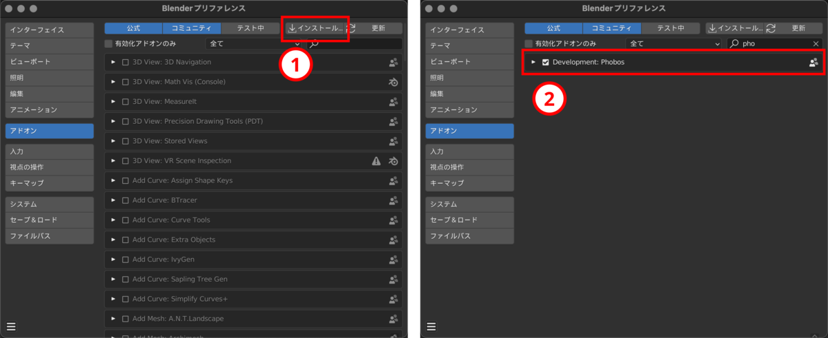 - Phobosのアドオンが表示されるのでチェックをいれる。