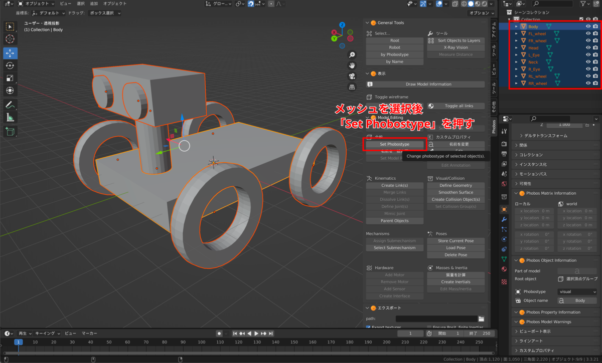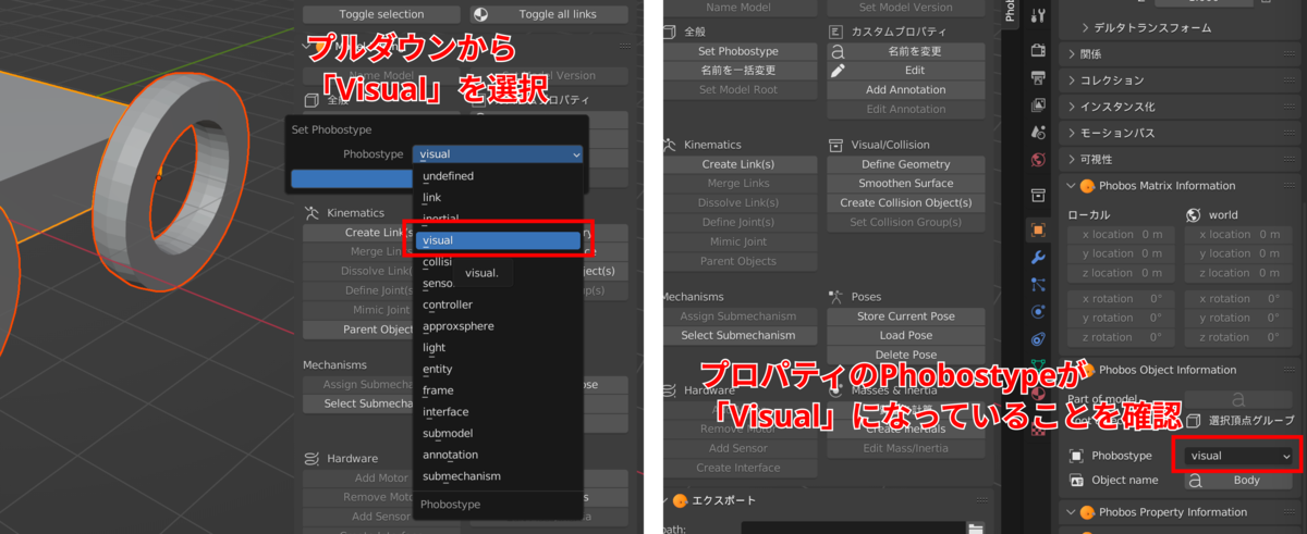 モデリングが完成したら各メッシュのPhobos Typeを「Visual」に設定します。