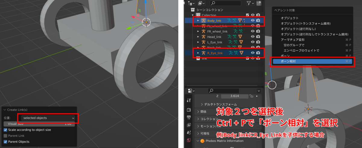 対象2つ選択後、Ctrl+Pを押すことでペアレントメニューが表示されるので「ボーン相対」を選択しどんどん親子関係を整理していきましょう。