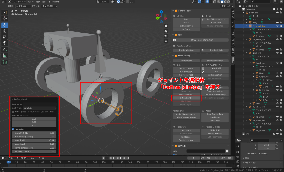 ジョイントを選択後「Define Joint(s)」を押すことでジョイントの形状が変化し、ロボットの細かい制御の値などが編集できるようになります。