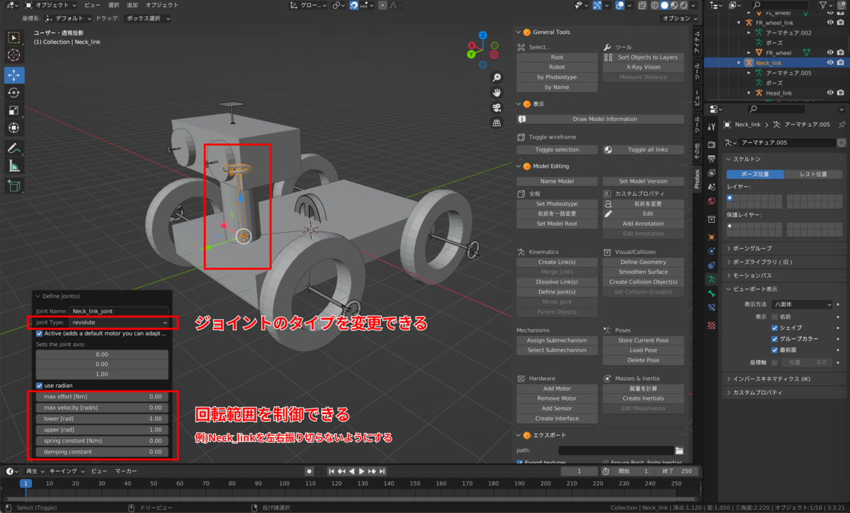 例えばロボットの首の部分に旋回用のJoint Typeを設定し、Lower/Upperの値を変更することで左右首を振り切らないようにできます。