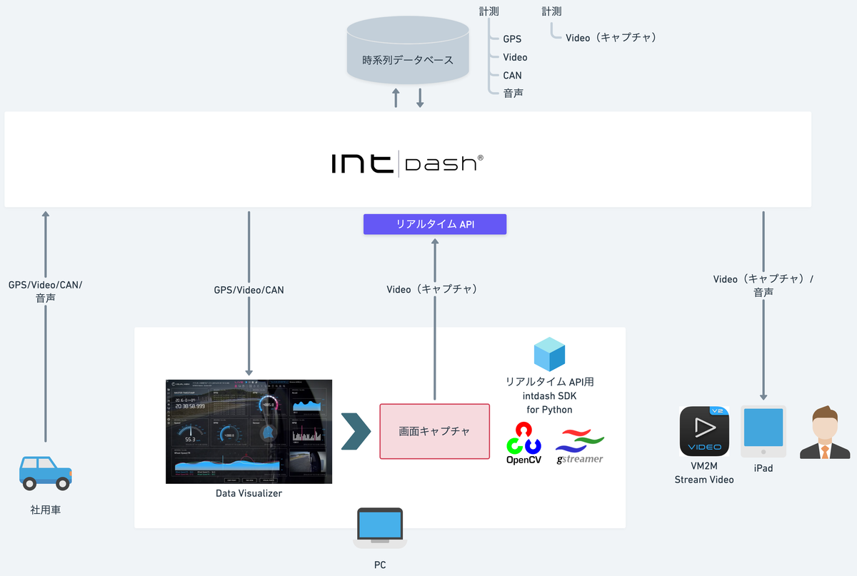 計測データをData Visualizerで再生し、PC画面をキャプチャしてリアルタイムAPI用intdash SDKでアップストリームします。