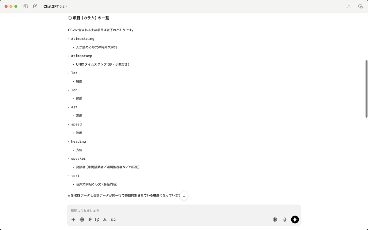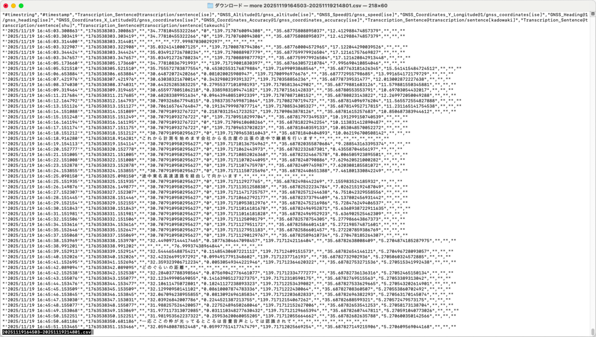 音声通話アプリで収集した、自動車走行中のGNSSデータと複数名(車両搭乗者、遠隔監視者)の会話のCSVデータをアップロードします。 GNSSデータ(緯度経度、速度、高度、方位)、会話(音声文字起こし文)が含まれます。 課題:車両走行に渋滞していたか のためにデータ分析を行います。 以下を確認してください。 - 項目の一覧 - データ行数 - タイムスタンプ範囲