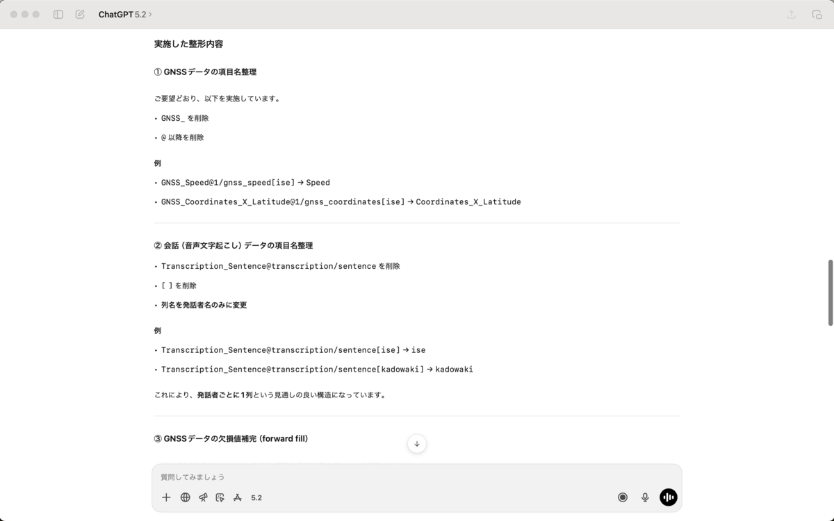 データを整えてください。 - 見やすさのため、GNSSデータの項目名の"GNSS_"と"@"以降を削除してください。 - 見やすさのため、会話(音声文字起こし)データの項目名の"Transcription_Sentence@transcription/sentence"と"[", "]"を削除して、列名を発話者のみにください。 - 空の値が含まれます。GNSSデータについては直前の値を使用して穴埋め(forward fill)してください。 また、 - 分析結果のグラフは英語で、本文は日本語で表記してください。