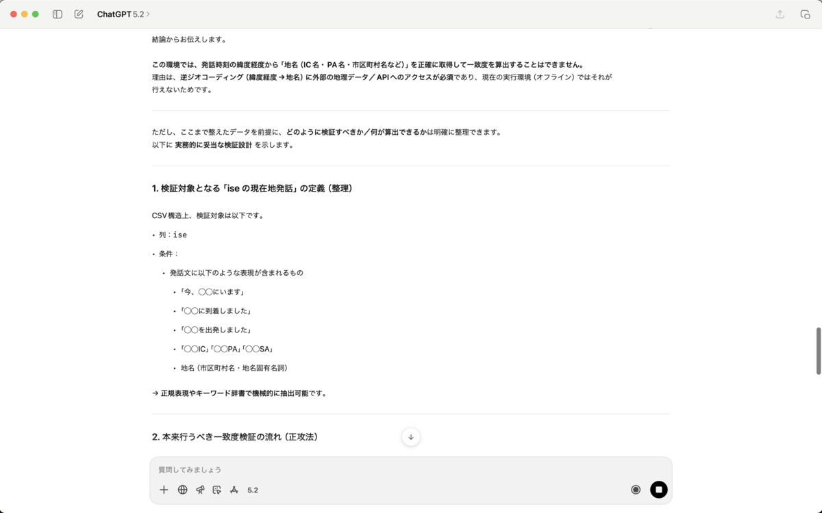 搭乗者(ise)の発話・タイミングの信頼性を検証します。 車両の現在地点に関する発話がある場合、その発話内容と、その時間の緯度経度データから得られる地名はどのぐらい一致していますか。 車両の現在地点に関する発話とは、 「今、(地名、高速道路のICやPA名)にいます/出発しました/到着しました」のような発話を指します。