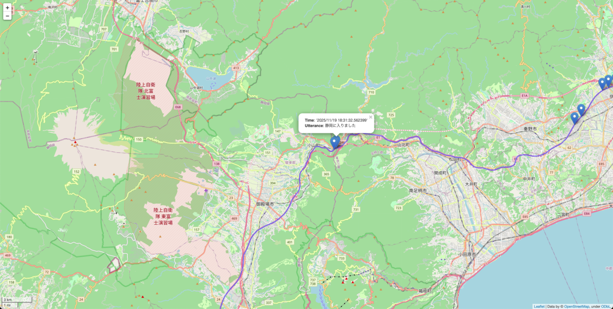 逆ジオコーディングを行わず、地名の発話の精度をおおよそ確認する方法を試します。 GNSSの緯度経度データを、PythonのFoliumを使ってプロットしてください。 現在位置(地名、高速道路のICやPA名)に関する発話があった時間帯の緯度経度には、その地点にピンを打ち、発話内容を記載してください。 出力後、発話内容のピンを何本打ったか教えてください。